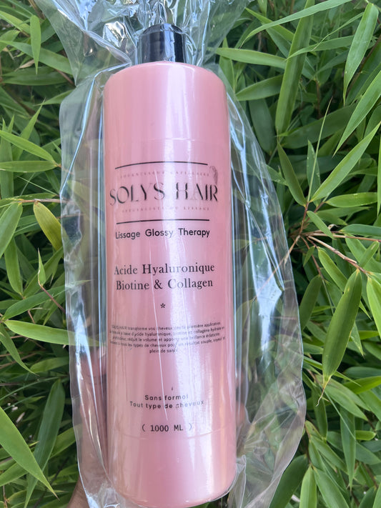 Découvrez notre Lissage Collagène Glossy une thérapie capillaire sans formol révolutionnaire à base de collagène, acide hyaluronique et biotine, conçue pour offrir un lissage 100% lisse tout en réparant en profondeur vos cheveux et obtenir un effet miroir.